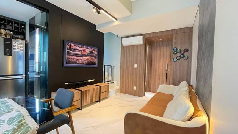 1 Sala ampla de TV, toda decorada, com piso em porcelanato e iluminação planejada
