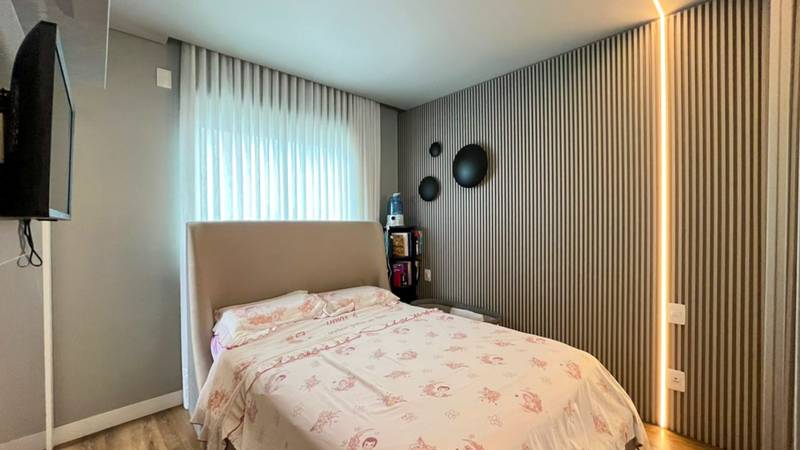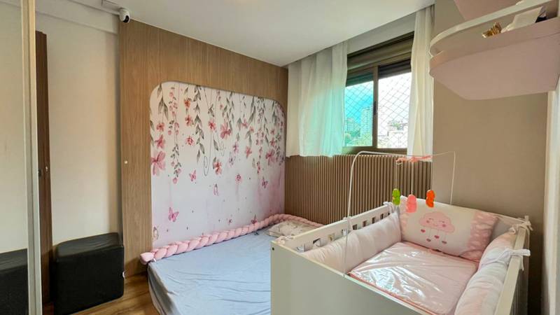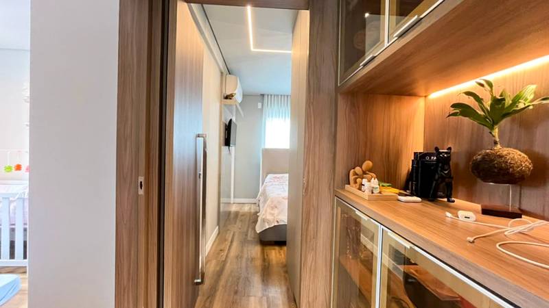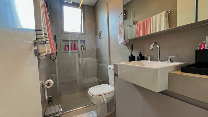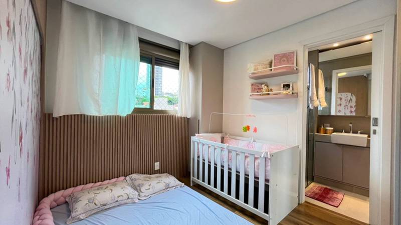 2 Quartos amplos, todos com iluminação planejada, piso em laminado de madeira e armários planejados, sendo duas suítes com bancada em granito, armários, espelho e box em blindex