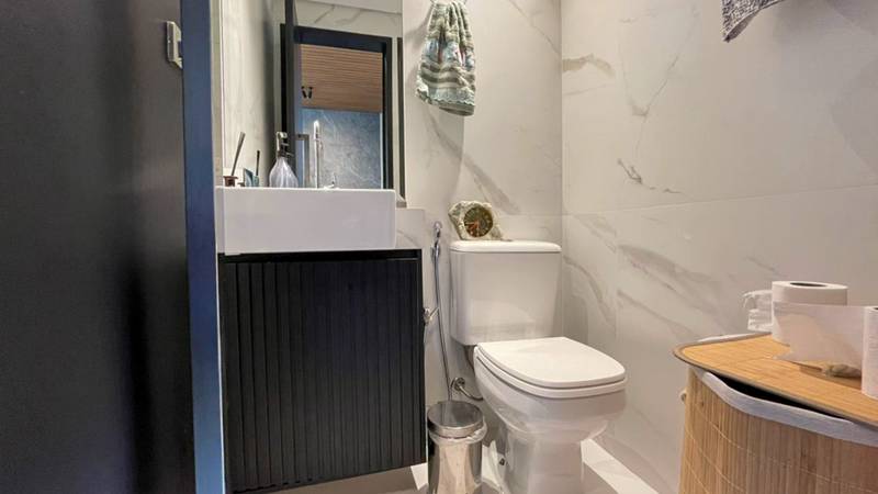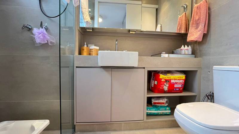 Banheiro social com espelho, bancada em granito, armários e box em blindex