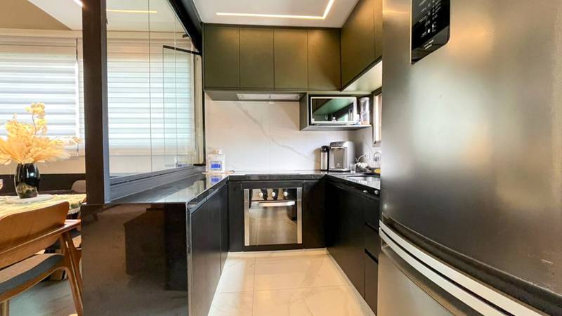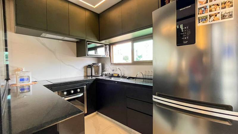 Cozinha ampla com iluminação planejada, bancada em granito, piso em porcelanato e armários planejados