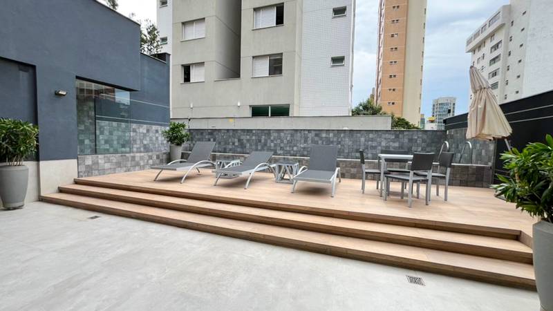 Área privativa completa e decorada, com bancada e pia em granito, deck e jacuzzi