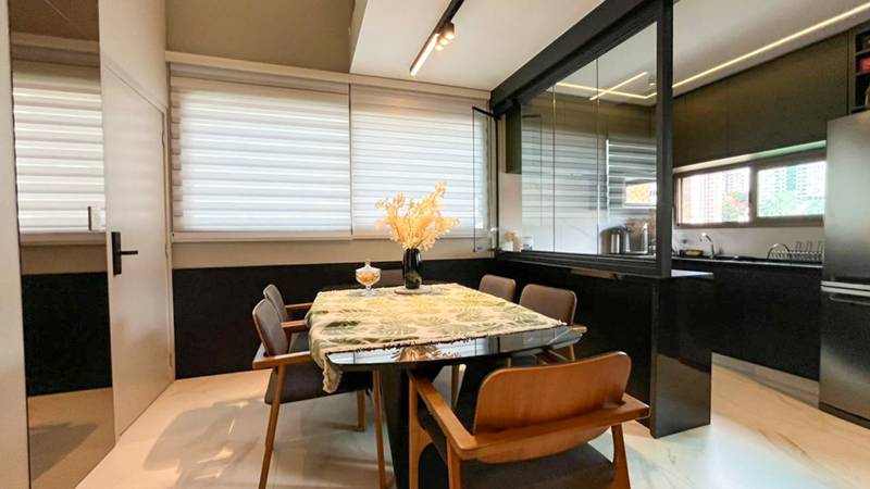 1 Sala ampla para dois ambientes, toda decorada, com piso em porcelanato, teto rebaixado e iluminação planejada